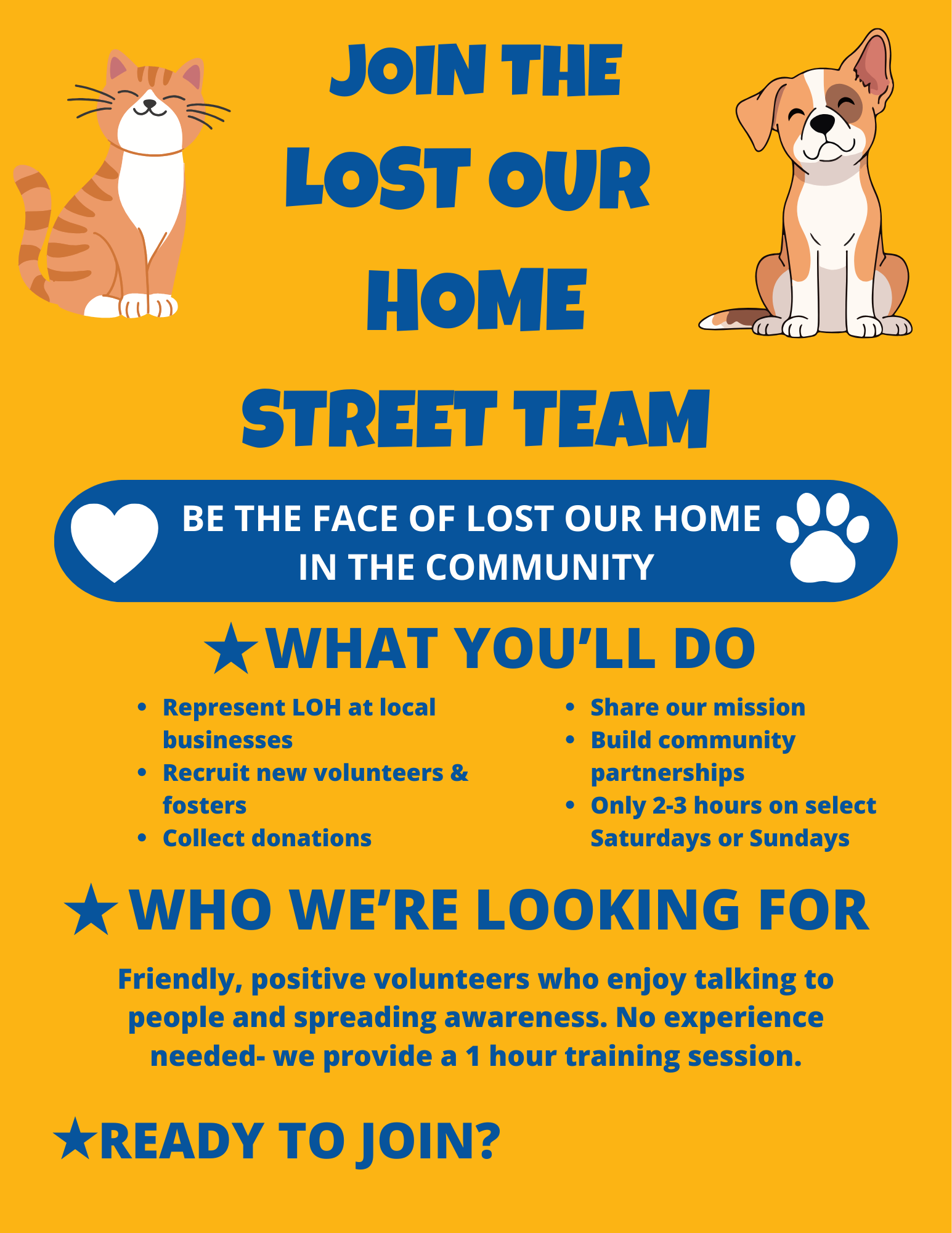 Creativity and location ideas welcome! Any activity raises awareness of LOH, and is a win for the pets and people we serve!